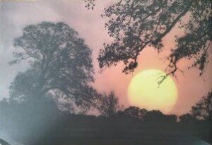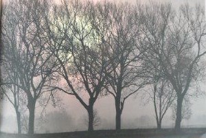 De foto die deze tekst in de bundel flankeert, vormt er misschien een beter paar mee, dan de vorige twee. Het lukt mij in elk geval in de donkere boompartijen de ruggen van grote mestkevers te zien. Maar vooral het gedicht vind ik beter. De tweede strofe associeert niet alleen met de foto, maar maakt door zijn beeldend vermogen de foto zelfs (bijna) overbodig. Ja, nu dreigt het weer té goed te worden! Zonder gekheid: het gedicht heeft wel wat. De derde strofe is werkelijk een topper. Een paradoxaal lichtvoetig zeggen van iets (onnoemelijk) zwaars en éénmaligs als de dood, in een alledaags, veel voorkomend zinnetje dat weinig om het lijf lijkt te hebben. Alsof je in je leven zomaar zappen kunt van de ene, naar de andere sfeer… Hoe bestaat het!