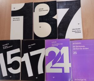Mijn drieëndertigste bundel was de tweede van Gust Gils, en opnieuw met een opvallende titel: Afschuwelijke roze yoghurtman en een opvallend omslag waarop vooral het getal 24 opviel. Ik werd niet alleen geïntrigeerd door de gedichten van Gils, maar ook door dat getal. Zeker toen ik –later in 1974- een bundel kocht met het nummer 15 en daags erna eentje met nummer 3. Het waren respectievelijk De quark en de grootsmurf van Jan Elburg en mijn derde Gust Gils, Levend voorwerp. De raadselachtige omslagen werd mij duidelijk, waren onderdeel van een reeks poëzie-uitgaven van De Bezige Bij. Het werd een sport voor me om meer van die bundeltjes te pakken te krijgen. In de loop van dat jaar vond ik er nog twee: Arie van den Bergs Mijn broertje kende nog geen kroos (nummer 13) en nummer 3: De poëtische bijl van Wim Huyskens.