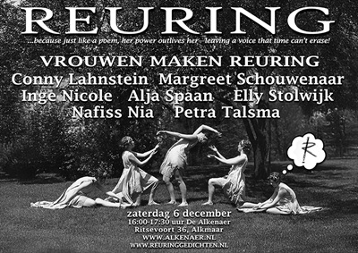 Zondagmiddag 16 november een dichtmiddag in Eijlders met 'al het vrouwelijke', met Monique Boogmans, Katelijne Brouwer, Mereie de Jong en Maaike Elise van Steenis en hun (debuut)bundels. Aanvang 14.30 uur. Andere vrouwen en dichters natuurlijk van harte welkom.