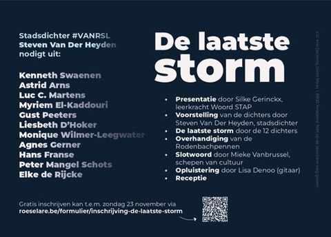 Op de agenda van het Poëziecentrum: zaterdag 15 november 11.00 uur Poëziewandeling door Nijmegen, zondag 16 november in de Maria kapel 14.30-16.30 uur de derde H.H. ter Balkt lezing door Eva Meijer, zaterdag 29 november de hele dag boekenkraam op het Mariënburgplein en 6 december 12.00-13.30 uur Lunchpauzepoëzie met Wim van Til. Vooraf aanmelden kan hier.